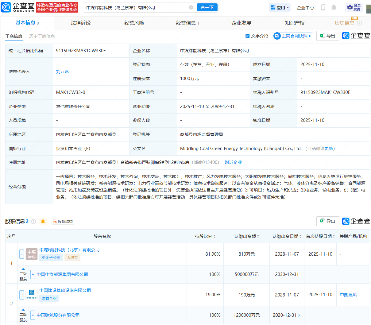 近日,中煤绿能科技(乌兰察布)有限公司成立炒股配资论坛官网,法定代表人为刘万喜,注册资本为1000万元,经营范围包含:风力发电技术服务;太阳能发电技术服务;储能技术服务;站用加氢及储氢设施销售等。企查查股权穿透显示,该公司由中国中煤能源集团有限公司旗下中煤绿能科技(北京)有限公司、中国建筑(601668)旗下中国建设基础设施有限公司共同持股。