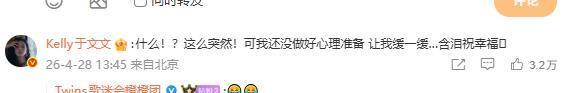 于文文连用多个感叹号和问号,直言“什么!?这么突然!可我还没做好心理准备 让我缓一缓…含泪祝幸福”。措辞中既透着“惊吓”情绪,又饱含真挚祝福,这种充满反差感的回应被网友戏称为“本体吓出来了”,更有人精准形容:“像极了粉丝听到偶像结婚的样子。”
