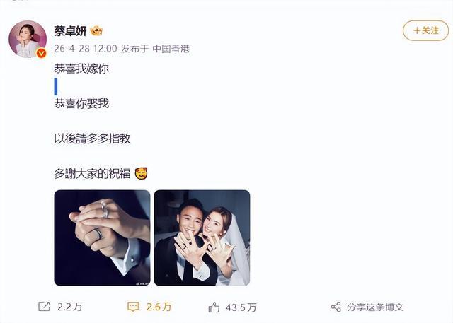 4月28日,蔡卓妍(阿Sa)在微博晒出与小10岁健身教练林俊贤的婚纱照,配文“恭喜我嫁你,恭喜你娶我”,毫无预兆地宣布结婚喜讯,瞬间引爆全网。圈内好友纷纷送上祝福,而歌手于文文在评论区的一则留言,却因过于真实的反应成为焦点。